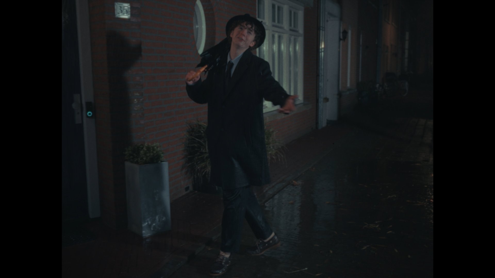 As we were working with a budget of well, nothing, we had to get creative. With no money for rain machines we violently sprayed around two garden hoses to create the rain for the video. Without rain this movie would have been called: Singin' in the street. Now that sounds way less exiting, doesn't it.